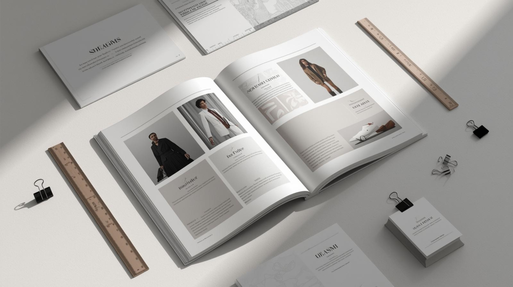 Supports éditoriaux et marketing avec une finition haut de gamme, cohérents avec l’identité.